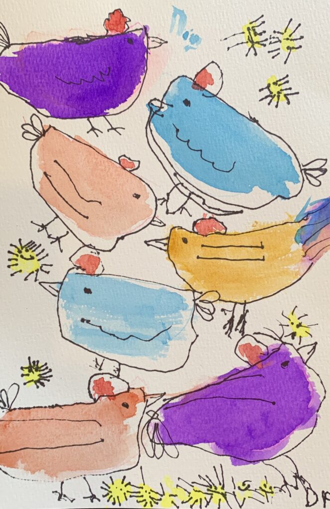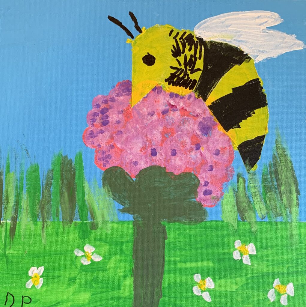 Donna P. “Hens & Chicks” watercolor & pen 2026 “Busy Bee” acrylic 2026 “Ladybug Shamrock” acrylic & collage 2026 “Flowery Heart” acrylic 2026 “Kandinsky Inspired” collage 2026 “Winter Cardinal” collage 2026