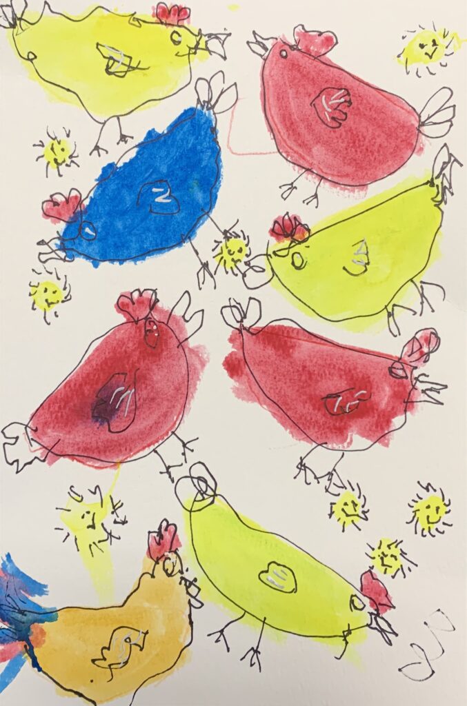 Un L. “Woof” acrylic 2026 “Hens & Chicks” watercolor & pen 2026 “Busy Bee” acrylic 2026 “Fire Horse” acrylic 2026 “Ladybug Shamrock” acrylic & collage 2026 “Winter Cardinals” collage 2026 “Colorful Pumpkins” watercolor & pen 2025 “Acorn” acrylic 2025 “Sunflowers” acrylic 2025 “Glass Tree” mixed media 2025 “Monster” acrylic paint-pens 2025 “Balloon Dog” collage 2025 “Sea Life” paper sculpture 2025 “Self Portrait” marker 2025 “Tree Frog” acrylic 2025 “Self Portrait” marker 2025 “Sardines” mixed media 2025 “Fireworks Star” mixed media 2025 “Fireworks” acrylic 2025 “Sea Turtles” mixed media 2025 “Daisies” acrylic 2025 “People” marker 2025 “Cats” clay & acrylic 2025 “Water Lilies” acrylic & collage 2025 “Flowers Blooming” mixed media 2025 “Robin’s Nest” acrylic & collage 2025 “Blue Bird” mixed media 2025 “Chicken & Egg” mixed media 2025 “Potted Plant” mixed media 2025 “Abstract” collage 2025 “Spring Bird” mixed media 2025 “Birds & Branches” mixed media 2025 “Tulip Bulbs” mixed media 2025 “Fox in the Snow” acrylic 2025 “Hot Dog” acrylic 2025